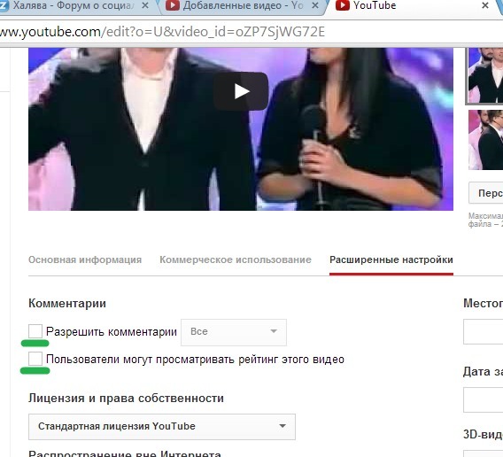Идём к видео, на которое хотим накрутить просмотры. Заходим в Расширенные настройки видео и убираем две галочки: Разрешить комментарии Пользователи могут просматривать... Сохраняемся.